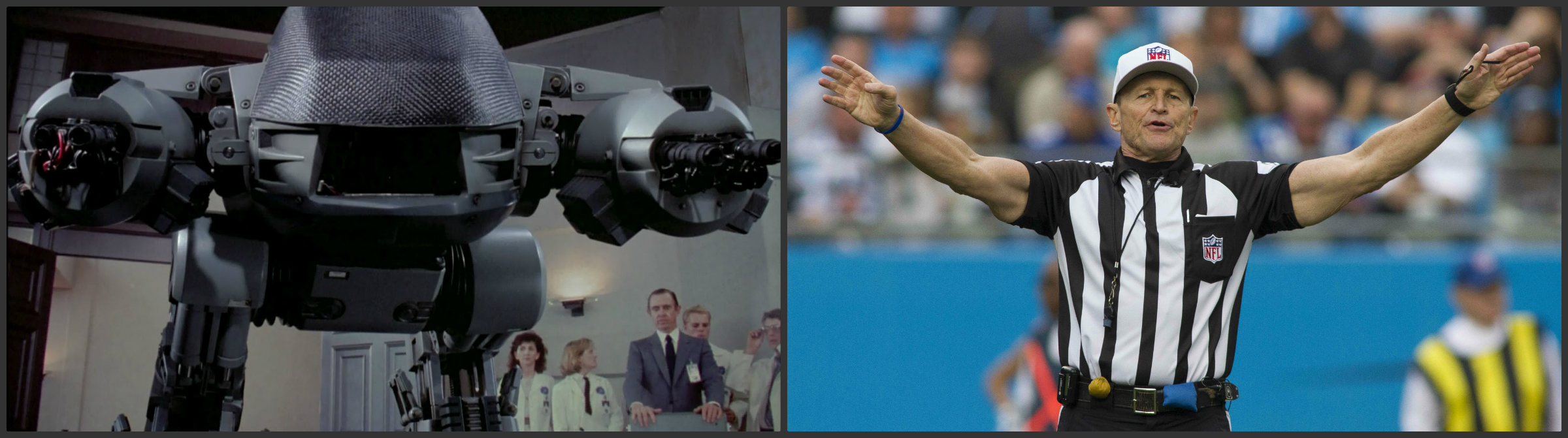 Detroit is still reeling from their playoff loss being mostly caused by a refereeing decision. They vow that it will never happen again. The come up with an automated robotic referee that will be the ultimate "tiebreaker." The Lions unveil this "electronic defender" or ED 209 as they call him, during week 3. It is immediately shut down as he viciously enforces the rules, riddling the defenseless body of Ed Hochuli with machine gun shells. It was a shock to see, but of no consequence; Hochuli cannot be killed by conventional weapons.