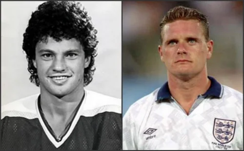 Dino Ciccarelli of the Caps on the left, Paul Gascoigne of the England National Team on the right...they really could be interchangeable. I could see Gazza crossing checking a dude in the face and Ciccarelli kicking in a PK and sliding to his knees in celebration. And Gazza looks like Michael Fassbender...well he did back then at least. lol WE'RE ALL CONNECTED!!!!