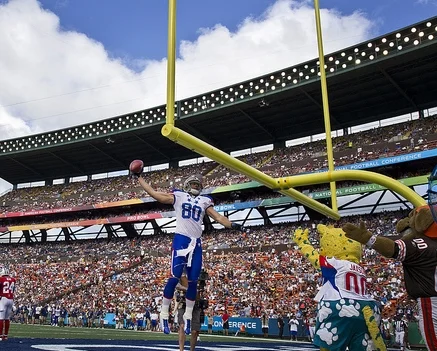 - After scoring his first touchdown of the year Jimmy Graham dunks over the goal post. Drew Brees rushes to stop him to keep the team from being penalized but the goal posts come crashing down on him, ending his season.