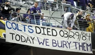 - Jim Irsay, owner of the Indianapolis Colts, distraught over his 6 game suspension, ends up in a high-stakes poker game at a Native American Casino. He bets his stake in the Colts and loses to a mysterious poker player. When he awakes the next morning, he rushes to Lucas Oil Field in hopes to strike a deal with the new owners. He sees Mayflower moving trucks peeling out as he gets there and a note left on the jumbotron that says “Payback is a b-, isn’t it Jim? Baltimore sends their best. Love the LOS ANGELES Colts.”