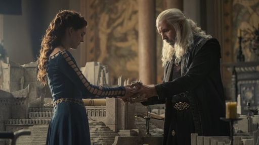 There’s an interesting piece of Game of Thrones Lore that if the throne is cutting the one sitting on it, then it is literally rejecting that ruler. Hmmm. He asks the Maester and Otto about Alaena. The Grand Maester is all for it and encourages him. Otto, of course, disagrees with his own selfish volition. Grand Maester and Otto share a look and we begin to think that The Hand of the King is not the most favored of individuals. Honestly- get it. Viserys entertains this possible marriage reluctantly as we see him walking the garden with a VERY young Laena. Lord Corlys, Rhaenys, and Rhaenyra are all watching. She asks him some questions about Balerion and Vhagar. Viserys was the last rider of Balerion, the largest dragon in Westeros. Since Balerion passed, Vhagar now holds the title of "largest dragon", and she is living possibly off the coast of the narrow sea (which seems a little irresponsible of the Targaryens). She gives the King some spiel about giving him many children and being a loving and good wife. He asks if that’s what her father wanted her to say, and then asks what her mother said. She replies, “I wouldn’t have to bed you until I was 14”. He is truly unsettled. My God.