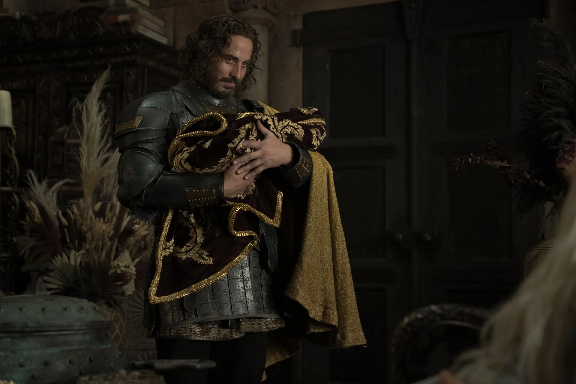 Ser Cristen Cole meets them at the door and his icy look shows he’s still not over Rhaenyra turning him down. They do say that the first cut’s the deepest, I guess? He lets them into the room where Alicent (Olivia Cooke) is majestically getting fitted for a gown, and honestly, it’s the perfect way to reintroduce her because you can tell she’s grown quite comfortable with her role. The Queen is shocked that Rhaenyra came herself and turns into the doting mother, requesting a cushion brought, etc. You can’t really tell if it’s genuine or not – which also shows us that Alicent has learned how to be more sly over the years. Viserys comes in and dotes on his new grandson and his daughter, Laenor announces the baby’s name is Joffrey. Alicent takes the baby to immediately peek under the blanket to see his hair color. She positively glides over to Leanor and says, “Do keep trying, sooner or later you may get one that looks like you.” She gives him an intentional look and glides back over to Viserys. The Queen also notes that Joffrey is an odd name for a Velaryon.