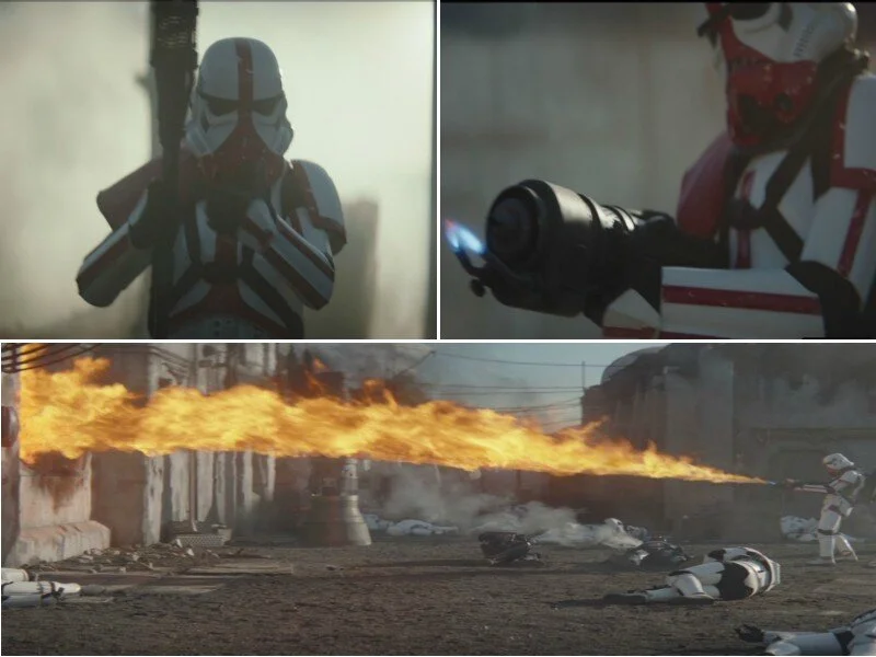 As they prepare to leave for the lava river to make their escape, the Armorer offers Mando one final parting gift: the Rising Phoenix, or as us non-Mandalorians would call it, a jet pack. Mando replenishes his munitions and Team Mando leaves. The Armorer again states she cannot leave until everything that can be salvaged is saved. She sits down in front of her smelting furnace, in a meditative position. A squad of stormtroopers come up to the seated Mandalorian and asks her where team Mando is. The only response she gives is an ass-whooping few have ever seen. Using only her hammer and tongs, she destroys the 5 man fire team, even smashing one of the Imp’s helmets right in front of his mouth, in a truly grisly moment.