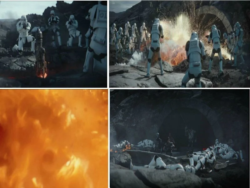 As they get near the mouth of the tunnel, Mando’s thermal imaging shows there is a whole squad of stormtroopers waiting for them. It’s a trap that they cannot shoot their way out of, as they have to pass through this choke point. IG-11 volunteers to give up his nursery/protection programming for his original factory settings: a self-destruct mode. The only way they can override his new programming, nurse and protect, is for him to be sure that someone else will ensure the Yodling’s safety. There is another fantastic emotional moment as Mando pleads with IG to try and find another way. They both know this is the only solution as IG-11 wades into the river of lava and walks towards the entrance. As he is pelted with blaster fire, he engages his self-destruct mode and takes out the entire squad of troopers, allowing the rest of team Mando to carry out his primary function: protect the child.