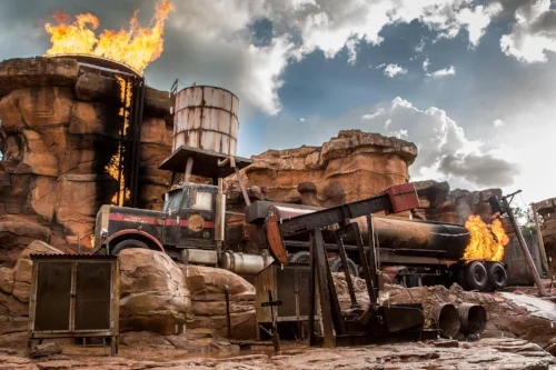 This part of the ride was the closest I’ve ever come from jumping out of a ride vehicle. I would have loved to sit in the cockpit of the snowspeeder and pretend I was Luke Skywalker. This would be enough for most movie buffs, but wait…there’s more! Your tram then drives through a portion of the tour called Catastrophe Canyon that is part of a “live movie set.” You got to see more up close special effects as the canyon begins to shake from an earthquake, a fuel tanker catches fire (still not sure how an earthquake would ‘shake’ a fire from a fuel tanker truck but whatever) and then, a tidal wave of water comes crashing into the canyon! It was a very cool, behind-the-scenes look at how movies were made and added to that Hollywood feel.