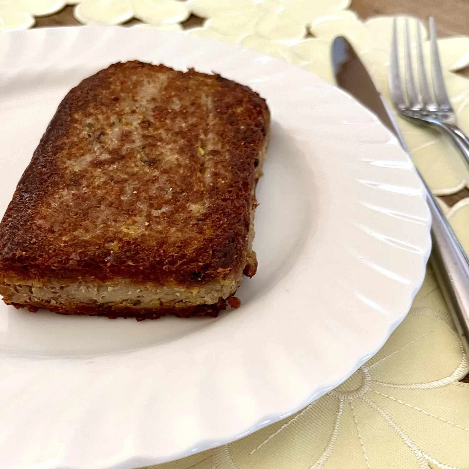 All jokes aside, the concept of scrapple is one that every single culture has their equivalent. It’s poor folks’ food. Scrapple took a foothold in the Philly area because of Pennsylvania Dutch settlers. Ya know, the Amish or Mennonites of Weird Al and reality show TV fame. They would use all the “undesirable” parts of a pig left over after slaughter. You will often hear that it’s “everything but the oink.” All those leftover bits, including organs, the head, etc is boiled (bones and all) to create a stock of sorts. The bits of meat that come off the bone in the boiling process are picked through and finely chopped. The bones are discarded, the bits of meat and dry cornmeal are added. The “mush” is then formed into loaves. Sounds yummy, huh? If the picture above wasn’t enough to entice you, I’m sure the description locked it in. However, before walking away from the concept, let’s see the scrapple after its glow up in the frying pan.